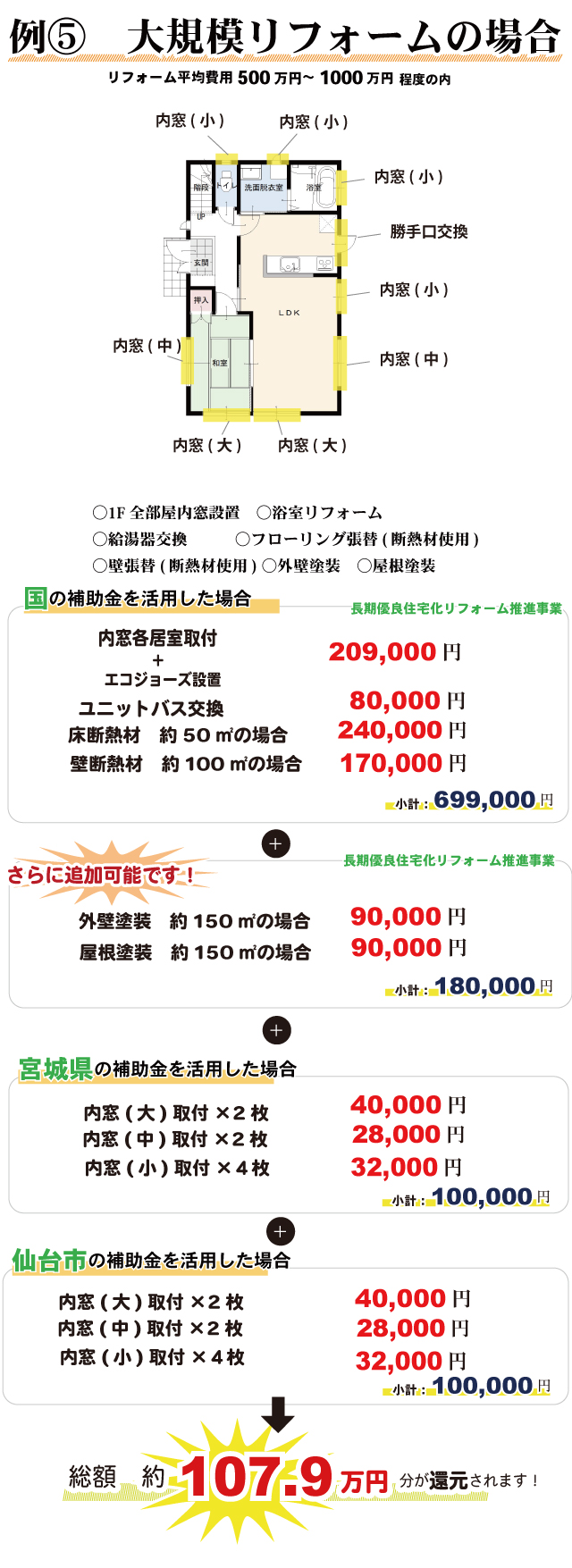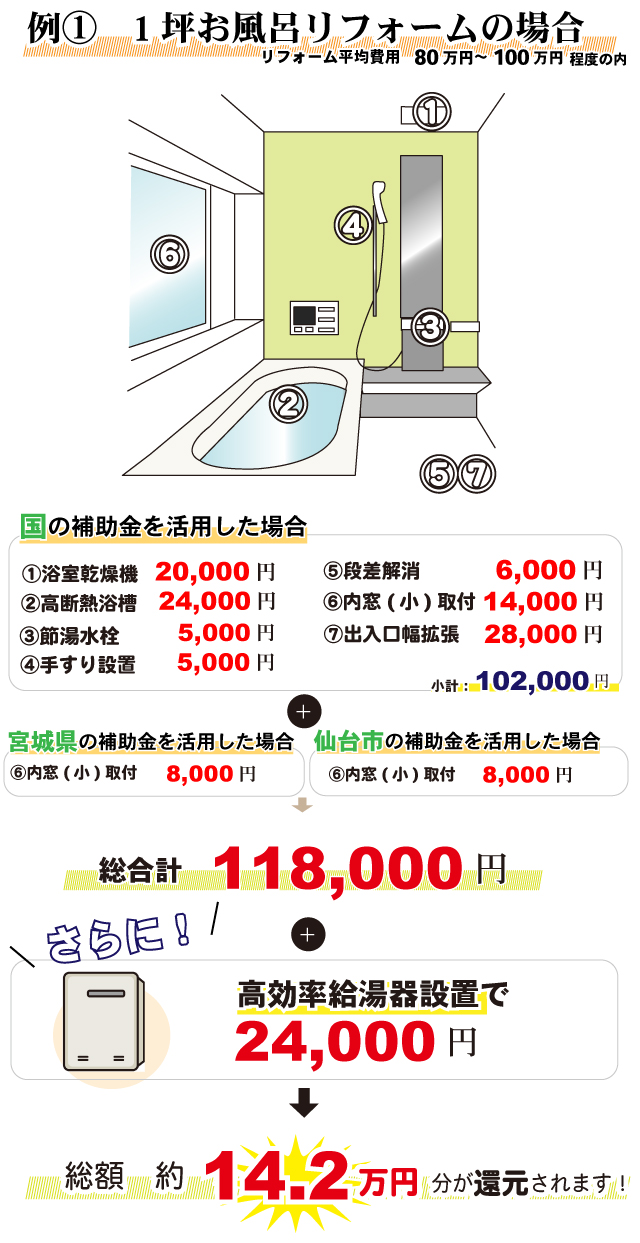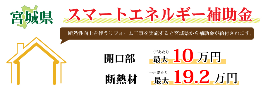 無料見積り・相談 電話で見積り・相談 0120-705-582 【受付】9:00~18:00【定休日】水曜日 電話で見積り・相談 HOME2022年補助金のご案内 国や宮城県、仙台市等各自治体から対象のリフォームをすると補助金を受け取ることができます。サンダイホームでは補助金を活用したリフォームの実績多数!ご興味がある方はお気軽にお問合せください。 2022年 活用できる主な補助金 交付申請期限 2021/11/26(金)~2023/3/31(金)※予算なくなり次第終了となるので詳細は担当にお尋ねください。※期間が延長されました。 対象工事 節水型トイレ、節湯水栓、高断熱浴槽、高効率給湯器、断熱改修工事(窓、ドア、外壁、屋根、 天井又は床)等 ※最低補助金額5万円(税込)以上が条件となります。 補助金額 一戸あたり 最大30万円 対象者 申請者が所有している住宅で対象必須工事を実施 受付期間 一次募集 2022/5/16(月)~5/27(金) 二次募集 2022/8/29(月)~9/9(金) 三次募集 2022/11/28(月)~12/9(金)※各募集区分の申請総額が予算額を上回った場合は、抽選により交付対象者を決定いたします。 対象工事 内窓、サッシ交換、ガラス交換、ドア交換、天井・壁・床断熱材等 補助金額 開口部 一戸あたり 最大10万円 断熱材 一戸あたり 最大19.2万円 対象者 宮城県内の住宅で申請者が所有&居住している住宅(賃貸住宅は対象外) ※詳細は担当にお尋ねください 申請期間 2022/4/1(金)~2023/1/31(火)※予算なくなり次第終了となるので詳細は担当にお尋ねください 対象工事 内窓、サッシ交換、ガラス交換等 補助金額 一戸あたり 最大10万円 対象者 申請者が仙台市在住で所有または居住している住宅 ※詳細は担当にお尋ねください 2022年 大規模リフォーム向け補助金 申請期間 2022/5/9(月)~2022/12/23(金)※予算なくなり次第終了となるので詳細は担当にお尋ねください 対象工事 内窓、サッシ交換、ガラス交換、断熱材、劣化対策、バリアフリー等※事前のインスペクション必須 ※国の補助金同士の併用は原則不可 補助金額 一戸あたり 最大100万円(補助率1/3) ※三世代同居対応改修工事を実施する場合や、若者・子育て世帯又は既存住宅の購入者がリフォームを行う場合は最大150万円(補助率1/3) 対象者 申請者が所有している住宅で対象必須工事を実施 ※詳細は担当にお尋ねください 補助金活用例 お問い合わせ サンダイホームでは補助金を活用したリフォームの実績多数!ご興味がある方はお気軽にお問合せください。 各種お問い合わせ 住まいのお悩み相談はこちらから 電話で相談する 自宅から相談する すぐにお悩みを解決 リフォームで最後までサポート WEBで相談する WEBから気軽に相談可能 オンライン相談も可能! 現状調査や見積もり依頼にも対応 ショールームで相談する 実際の商品を見ながら確認が可能 資料と合わせて説明を聞くことが可能 実際のリフォーム現場が見られる - トップに戻る - サンダイホーム・グループ サンダイ本社 サンダイ本社宮城県仙台市泉区長命ケ丘6-15-10 | 0120-70-5582 泉・青葉ショールーム仙台市泉区長命ケ丘 6-15-10 | 0120-70-5582 宮城野・多賀城ショールーム仙台市宮城野区中野字寺前 68-1 | 0120-70-5582 岩沼・名取ショールーム岩沼市栄町 1-9-1 | 0120-70-5582 営業部 リフォーム・リノベーション・新築仙台市泉区長命ケ丘 6-15-10 | 0120-70-5582 ライフサポート仙台市泉区長命ケ丘 6-15-10 | 0120-70-5582 解体仙台市泉区南中山 2-3-12 | 0120-70-5582 不動産仙台市泉区長命ケ丘 6-15-10 | 0120-70-5582 [統括管理会社]株式会社サンダイホーム|仙台市泉区長命ケ丘6-15-10|022-341-5152 [施工管理会社]株式会社住環境テック|仙台市泉区長命ケ丘6-15-10|022-341-5417