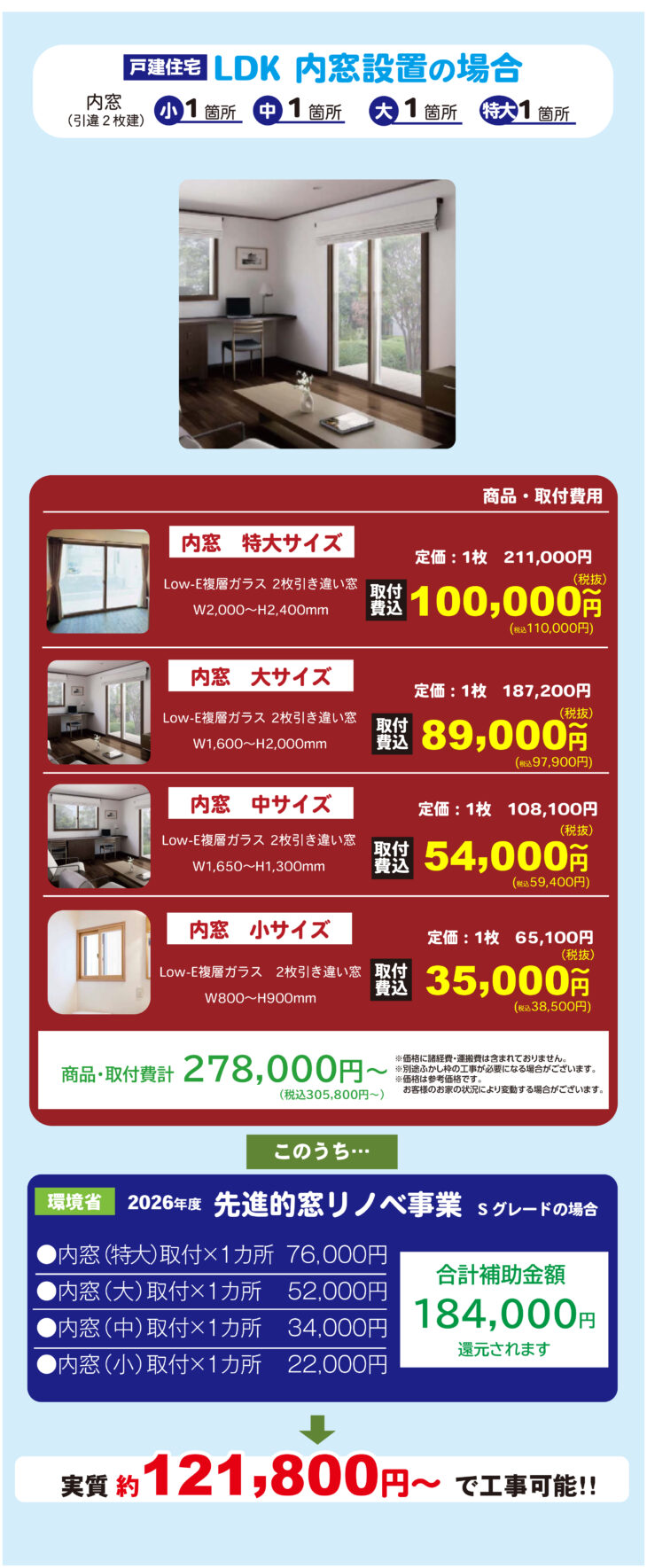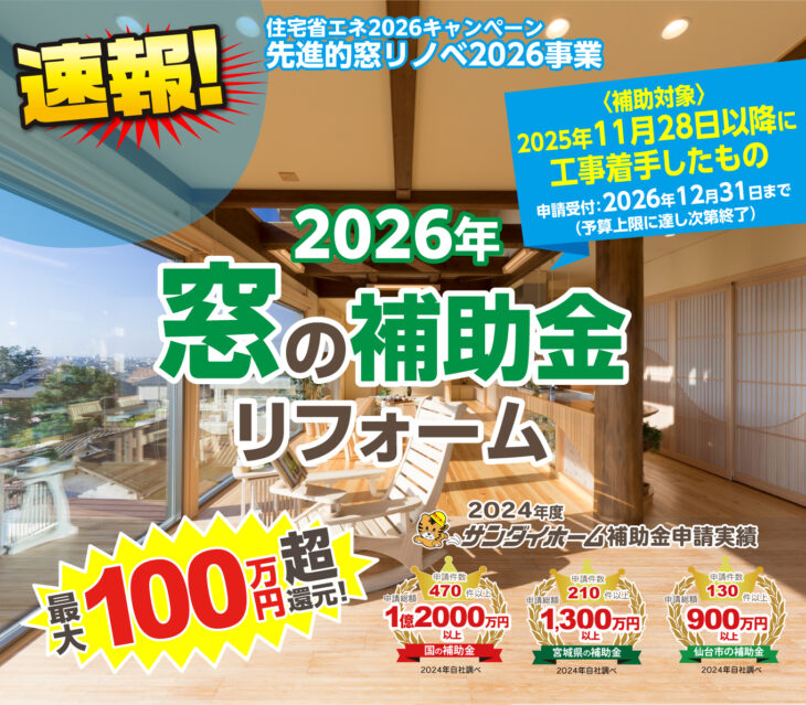 無料見積り・相談 電話で見積り・相談 0120-705-582 【受付】9:00~18:00【定休日】水曜日 電話で見積り・相談 HOME2026年 窓の補助金リフォーム 先進的窓リノベ2026事業は、断熱窓への改修を促進し既存住宅の省エネ化を促すことで、エネルギー費用負担の軽減、健康で快適なくらしの実現及び家庭からのCO2排出削減に貢献するとともに、断熱窓の生産効率向上による関連産業の競争力強化と成長を実現させることを目的とする事業です。サンダイホームは窓や玄関ドアなど開口部のリフォームの豊富な実績と経験がございます!お見積り無料。 補助金申請も一貫して行っておりますので興味のある方はお気軽にご相談ください。 サンダイホームおすすめ内窓 サンダイホームおすすめ内窓 他、内窓商品ページはこちら 先進的窓リノベ2026事業 概要 先進的窓リノベ2026事業 概要 窓リフォーム施工事例 各種お問い合わせ 住まいのお悩み相談はこちらから 電話で相談する 自宅から相談する すぐにお悩みを解決 リフォームで最後までサポート WEBで相談する WEBから気軽に相談可能 オンライン相談も可能! 現状調査や見積もり依頼にも対応 ショールームで相談する 実際の商品を見ながら確認が可能 資料と合わせて説明を聞くことが可能 実際のリフォーム現場が見られる - トップに戻る - サンダイホーム・グループ サンダイ本社 サンダイ本社宮城県仙台市泉区長命ケ丘6-15-10 | 0120-70-5582 泉・青葉ショールーム仙台市泉区長命ケ丘 6-15-10 | 0120-70-5582 宮城野・多賀城ショールーム仙台市宮城野区中野字寺前 68-1 | 0120-70-5582 岩沼・名取ショールーム岩沼市栄町 1-9-1 | 0120-70-5582 営業部 リフォーム・リノベーション・新築仙台市泉区長命ケ丘 6-15-10 | 0120-70-5582 ライフサポート仙台市泉区長命ケ丘 6-15-10 | 0120-70-5582 解体仙台市泉区南中山 2-3-12 | 0120-70-5582 不動産仙台市泉区長命ケ丘 6-15-10 | 0120-70-5582 [統括管理会社]株式会社サンダイホーム|仙台市泉区長命ケ丘6-15-10|022-341-5152 [施工管理会社]株式会社住環境テック|仙台市泉区長命ケ丘6-15-10|022-341-5417