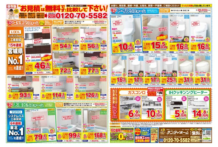 無料見積り・相談 電話で見積り・相談 0120-705-582 【受付】9:00~18:00【定休日】水曜日 電話で見積り・相談 HOMEリフォームコラム定番チラシ4月17日~6月30日まで有効 水廻り定番チラシ 4月17日~6月30日まで有効 水廻り定番チラシ 投稿日: 2022年4月5日 カテゴリー:定番チラシ 平素は格別のご厚情を賜り、厚く御礼申し上げます。 2022年4月17日~6月30月まで有効 水廻り定番チラシが完成致しました。 水廻り商品や特典等見ごたえ十分のチラシとなっております。 また、弊社ではお客様に安心してご来場いただけるよう 各ショールームに於いて三密対策を徹底いたしております。 気になる商品等ございましたらお気軽にお問い合わせください。 定番チラシ リフォームコラム一覧 最新の投稿 年末年始休業のお知らせ 【速報】国の補助金2026年度版が発表されました 夏季休業のお知らせ ゴールデンウィーク休業のお知らせ 【お知らせ】「サンダイホーム」と「東北電力」は リフォーム・リノベーション事業で業務提携します! 【速報】国水廻り補助金 子育てグリーン住宅支援事業詳細が発表されました 【泉・青葉ショールーム】新しいキッチン入荷しました 【泉・青葉ショールーム】新しいキッチン入荷しました 年末年始休業のお知らせ 【泉・青葉ショールーム】新しいキッチン入荷しました カテゴリー 展示品 (5) イベントチラシ (1) お知らせ (30) 定番チラシ (18) コラム (4) その他 (1) 月別アーカイブ 2025年12月 (1) 2025年11月 (1) 2025年8月 (1) 2025年4月 (1) 2025年2月 (3) 2024年12月 (4) 2024年11月 (2) 2024年10月 (2) 2024年8月 (2) 2024年6月 (1) 2024年5月 (1) 2024年4月 (2) サンダイホームについて サンダイの10のこだわり 会社案内代表挨拶会社概要企業理念店舗情報 リフォームの流れ よくあるご質問 サンダイホームの受賞実績 補助金・助成金について 震災への取り組み プライバシーポリシー 新築施工事例 施工事例一覧 補助金活用リフォーム リノベーション 増改築リフォーム マンション 新築 キッチンリフォーム 浴室リフォーム 給湯器・エコキュート トイレリフォーム 洗面リフォーム 窓・玄関 内装リフォーム 外壁・屋根リフォーム 塗装リフォーム 外構リフォーム お客様の声 お客様の声一覧 イベント情報 イベント情報一覧リフォームメニュー お買い得商品 LIXIL サンダイオリジナルシャワートイレ(チラシ掲載商品) ¥114,000~(税込) ショールーム展示 TOTO サザナHTシリーズ Sタイプ(宮城野・多賀城店展示) ¥1,028,000~(税込) 内窓リフォーム YKKAP プラマードU 2枚建引違い(Low-E複層ガラス) 小サイズ ¥30,000円~(税込) 玄関ドアリフォーム YKKAP 高断熱玄関ドア ドアリモ D30(チラシ掲載商品) ¥234,000円~(税込) キッチンリフォーム LIXIL シエラS(チラシ掲載商品) ¥605,000~(税込) 浴室リフォーム TOTO サザナHTシリーズ Nタイプ(チラシ掲載商品) ¥848,000~(税込) トイレリフォーム LIXIL サンダイオリジナルシャワートイレ(チラシ掲載商品) ¥114,000~(税込) 洗面化粧台リフォーム LIXIL ピアラ( 3店舗展示) ¥181,000~(税込) 給湯器リフォーム Paloma エコジョーズ ¥128,000円~(税込) シャッター・雨戸 LIXIL リフォームシャッター 手動標準タイプ(チラシ掲載商品) ¥119,000円~(税込) リフォームメニュー一覧 お買い得商品 ショールーム展示 内窓リフォーム 玄関ドアリフォーム キッチンリフォーム 浴室リフォーム トイレリフォーム 洗面化粧台リフォーム 給湯器リフォーム シャッター・雨戸 お役立ち情報 ショールーム紹介 不動産情報 各種お問い合わせ お問い合わせ 無料お見積もり 資料請求 イベント参加 各種お問い合わせ 住まいのお悩み相談はこちらから 電話で相談する 自宅から相談する すぐにお悩みを解決 リフォームで最後までサポート WEBで相談する WEBから気軽に相談可能 オンライン相談も可能! 現状調査や見積もり依頼にも対応 ショールームで相談する 実際の商品を見ながら確認が可能 資料と合わせて説明を聞くことが可能 実際のリフォーム現場が見られる - トップに戻る - サンダイホーム・グループ サンダイ本社 サンダイ本社宮城県仙台市泉区長命ケ丘6丁目15-10 | 0120-705-582 泉・青葉ショールーム宮城県仙台市泉区長命ケ丘6丁目15-10 | 0120-705-582 宮城野・多賀城ショールーム宮城県仙台市宮城野区中野寺前68-1 | 0120-705-582 岩沼・名取ショールーム宮城県岩沼市栄町1丁目9-1 | 0120-705-582 営業部 リフォーム・リノベーション・新築宮城県仙台市泉区長命ケ丘6丁目15-10 | 0120-705-582 ライフサポート宮城県仙台市泉区長命ケ丘6丁目15-10 | 0120-705-582 解体宮城県仙台市泉区長命ケ丘6丁目15-10 | 0120-550-130 不動産宮城県仙台市泉区長命ケ丘6丁目15-10 | 0120-105-272 [統括管理会社]株式会社サンダイホーム|宮城県仙台市泉区長命ケ丘6丁目15-10|022-341-5152 [施工管理会社]株式会社住環境テック|宮城県仙台市泉区長命ケ丘6丁目15-10|022-341-5417