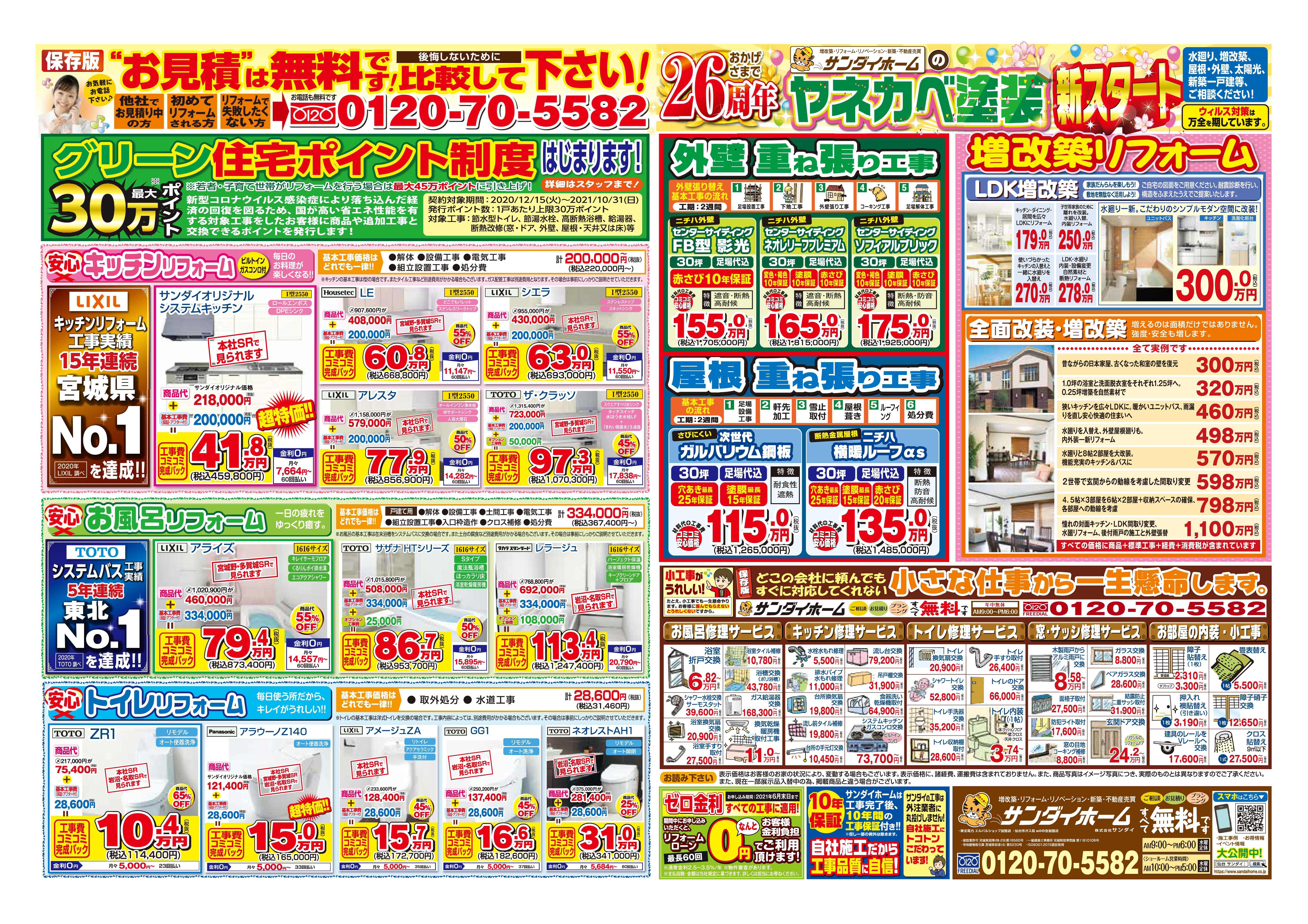 無料見積り・相談 電話で見積り・相談 0120-705-582 【受付】9:00~18:00【定休日】水曜日 電話で見積り・相談 HOMEリフォームコラム定番チラシ2021年7月~8月末まで有効 定番チラシ 2021年7月~8月末まで有効 定番チラシ 投稿日: 2021年7月8日 カテゴリー:定番チラシ 平素は格別のご厚情を賜り、厚く御礼申し上げます。 2021年7月~8月末まで有効 定番チラシが完成致しました。 サンダイホームでは新商品、ヤネカベ塗装を始めました。 そのほか、水廻り商品や定番メニュー等見ごたえ十分のチラシとなっております。 また、弊社ではお客様に安心してご来場いただけるよう 各ショールームに於いて三密対策を徹底いたしております。 気になる商品等ございましたらお気軽にお問い合わせください。 定番チラシ リフォームコラム一覧 最新の投稿 年末年始休業のお知らせ 【速報】国の補助金2026年度版が発表されました 夏季休業のお知らせ ゴールデンウィーク休業のお知らせ 【お知らせ】「サンダイホーム」と「東北電力」は リフォーム・リノベーション事業で業務提携します! 【速報】国水廻り補助金 子育てグリーン住宅支援事業詳細が発表されました 【泉・青葉ショールーム】新しいキッチン入荷しました 【泉・青葉ショールーム】新しいキッチン入荷しました 年末年始休業のお知らせ 【泉・青葉ショールーム】新しいキッチン入荷しました カテゴリー 展示品 (5) イベントチラシ (1) お知らせ (30) 定番チラシ (18) コラム (4) その他 (1) 月別アーカイブ 2025年12月 (1) 2025年11月 (1) 2025年8月 (1) 2025年4月 (1) 2025年2月 (3) 2024年12月 (4) 2024年11月 (2) 2024年10月 (2) 2024年8月 (2) 2024年6月 (1) 2024年5月 (1) 2024年4月 (2) サンダイホームについて サンダイの10のこだわり 会社案内代表挨拶会社概要企業理念店舗情報 リフォームの流れ よくある質問 サンダイホームの受賞実績 補助金・助成金について 震災への取り組み プライバシーポリシー 新築施工事例 施工事例一覧 補助金活用リフォーム リノベーション 増改築リフォーム マンション 新築 キッチンリフォーム 浴室リフォーム 給湯器・エコキュート トイレリフォーム 洗面リフォーム 窓・玄関 内装リフォーム 外壁・屋根リフォーム 塗装リフォーム 外構リフォーム お客様の声 お客様の声一覧 イベント情報 イベント情報一覧リフォームメニュー お買い得商品 LIXIL サンダイオリジナルシャワートイレ(チラシ掲載商品) ¥114,000~(税込) ショールーム展示 TOTO サザナHTシリーズ Sタイプ(宮城野・多賀城店展示) ¥1,028,000~(税込) 内窓リフォーム YKKAP プラマードU 2枚建引違い(Low-E複層ガラス) 小サイズ ¥30,000円~(税込) 玄関ドアリフォーム YKKAP 高断熱玄関ドア ドアリモ D30(チラシ掲載商品) ¥234,000円~(税込) キッチンリフォーム LIXIL シエラS(チラシ掲載商品) ¥605,000~(税込) 浴室リフォーム TOTO サザナHTシリーズ Nタイプ(チラシ掲載商品) ¥848,000~(税込) トイレリフォーム LIXIL サンダイオリジナルシャワートイレ(チラシ掲載商品) ¥114,000~(税込) 洗面化粧台リフォーム LIXIL ピアラ( 2店舗展示) ¥171,000~(税込) 給湯器リフォーム Paloma エコジョーズ ¥128,000円~(税込) シャッター・雨戸 LIXIL リフォームシャッター 手動標準タイプ(チラシ掲載商品) ¥119,000円~(税込) リフォームメニュー一覧 お買い得商品 ショールーム展示 内窓リフォーム 玄関ドアリフォーム キッチンリフォーム 浴室リフォーム トイレリフォーム 洗面化粧台リフォーム 給湯器リフォーム シャッター・雨戸 お役立ち情報 ショールーム紹介 不動産情報 各種お問い合わせ お問い合わせ 無料お見積もり 資料請求 イベント参加 各種お問い合わせ 住まいのお悩み相談はこちらから 電話で相談する 自宅から相談する すぐにお悩みを解決 リフォームで最後までサポート WEBで相談する WEBから気軽に相談可能 オンライン相談も可能! 現状調査や見積もり依頼にも対応 ショールームで相談する 実際の商品を見ながら確認が可能 資料と合わせて説明を聞くことが可能 実際のリフォーム現場が見られる - トップに戻る - サンダイホーム・グループ サンダイ本社 サンダイ本社宮城県仙台市泉区長命ケ丘6-15-10 | 0120-70-5582 泉・青葉ショールーム仙台市泉区長命ケ丘 6-15-10 | 0120-70-5582 宮城野・多賀城ショールーム仙台市宮城野区中野字寺前 68-1 | 0120-70-5582 岩沼・名取ショールーム岩沼市栄町 1-9-1 | 0120-70-5582 営業部 リフォーム・リノベーション・新築仙台市泉区長命ケ丘 6-15-10 | 0120-70-5582 ライフサポート仙台市泉区長命ケ丘 6-15-10 | 0120-70-5582 解体仙台市泉区南中山 2-3-12 | 0120-70-5582 不動産仙台市泉区長命ケ丘 6-15-10 | 0120-70-5582 [統括管理会社]株式会社サンダイホーム|仙台市泉区長命ケ丘6-15-10|022-341-5152 [施工管理会社]株式会社住環境テック|仙台市泉区長命ケ丘6-15-10|022-341-5417