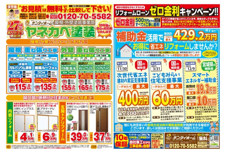 無料見積り・相談 電話で見積り・相談 0120-705-582 【受付】9:00~18:00【定休日】水曜日 電話で見積り・相談 HOMEリフォームコラム定番チラシ8月26日~9月30日まで有効 ヤネカベ塗装チラシ 8月26日~9月30日まで有効 ヤネカベ塗装チラシ 投稿日: 2022年8月6日 カテゴリー:定番チラシ 平素は格別のご厚情を賜り、厚く御礼申し上げます。2022年8月26日~9月30日まで有効 ヤネカベ塗装定番チラシが完成致しました。現在、国や宮城県等各自治体が省エネリフォームに補助制度を設けております!サンダイホームでは少しでもお客様がお得にリフォームができるように、補助金を活用したリフォーム等、お客様のご要望に沿ったご提案をさせていただきます。各ショールームではお客様に安心してご来場いただけるよう三密対策を徹底いたしております。気になる商品等ございましたらお気軽にお問い合わせください。 定番チラシ リフォームコラム一覧 最新の投稿 年末年始休業のお知らせ 【速報】国の補助金2026年度版が発表されました 夏季休業のお知らせ ゴールデンウィーク休業のお知らせ 【お知らせ】「サンダイホーム」と「東北電力」は リフォーム・リノベーション事業で業務提携します! 【速報】国水廻り補助金 子育てグリーン住宅支援事業詳細が発表されました 【泉・青葉ショールーム】新しいキッチン入荷しました 【泉・青葉ショールーム】新しいキッチン入荷しました 年末年始休業のお知らせ 【泉・青葉ショールーム】新しいキッチン入荷しました カテゴリー 展示品 (5) イベントチラシ (1) お知らせ (30) 定番チラシ (18) コラム (4) その他 (1) 月別アーカイブ 2025年12月 (1) 2025年11月 (1) 2025年8月 (1) 2025年4月 (1) 2025年2月 (3) 2024年12月 (4) 2024年11月 (2) 2024年10月 (2) 2024年8月 (2) 2024年6月 (1) 2024年5月 (1) 2024年4月 (2) サンダイホームについて サンダイの10のこだわり 会社案内代表挨拶会社概要企業理念店舗情報 リフォームの流れ よくある質問 サンダイホームの受賞実績 補助金・助成金について 震災への取り組み プライバシーポリシー 新築施工事例 施工事例一覧 補助金活用リフォーム リノベーション 増改築リフォーム マンション 新築 キッチンリフォーム 浴室リフォーム 給湯器・エコキュート トイレリフォーム 洗面リフォーム 窓・玄関 内装リフォーム 外壁・屋根リフォーム 塗装リフォーム 外構リフォーム お客様の声 お客様の声一覧 イベント情報 イベント情報一覧リフォームメニュー お買い得商品 LIXIL サンダイオリジナルシャワートイレ(チラシ掲載商品) ¥114,000~(税込) ショールーム展示 TOTO サザナHTシリーズ Sタイプ(宮城野・多賀城店展示) ¥1,028,000~(税込) 内窓リフォーム YKKAP プラマードU 2枚建引違い(Low-E複層ガラス) 小サイズ ¥30,000円~(税込) 玄関ドアリフォーム YKKAP 高断熱玄関ドア ドアリモ D30(チラシ掲載商品) ¥234,000円~(税込) キッチンリフォーム LIXIL シエラS(チラシ掲載商品) ¥605,000~(税込) 浴室リフォーム TOTO サザナHTシリーズ Nタイプ(チラシ掲載商品) ¥848,000~(税込) トイレリフォーム LIXIL サンダイオリジナルシャワートイレ(チラシ掲載商品) ¥114,000~(税込) 洗面化粧台リフォーム LIXIL ピアラ( 2店舗展示) ¥171,000~(税込) 給湯器リフォーム Paloma エコジョーズ ¥128,000円~(税込) シャッター・雨戸 LIXIL リフォームシャッター 手動標準タイプ(チラシ掲載商品) ¥119,000円~(税込) リフォームメニュー一覧 お買い得商品 ショールーム展示 内窓リフォーム 玄関ドアリフォーム キッチンリフォーム 浴室リフォーム トイレリフォーム 洗面化粧台リフォーム 給湯器リフォーム シャッター・雨戸 お役立ち情報 ショールーム紹介 不動産情報 各種お問い合わせ お問い合わせ 無料お見積もり 資料請求 イベント参加 各種お問い合わせ 住まいのお悩み相談はこちらから 電話で相談する 自宅から相談する すぐにお悩みを解決 リフォームで最後までサポート WEBで相談する WEBから気軽に相談可能 オンライン相談も可能! 現状調査や見積もり依頼にも対応 ショールームで相談する 実際の商品を見ながら確認が可能 資料と合わせて説明を聞くことが可能 実際のリフォーム現場が見られる - トップに戻る - サンダイホーム・グループ サンダイ本社 サンダイ本社宮城県仙台市泉区長命ケ丘6-15-10 | 0120-70-5582 泉・青葉ショールーム仙台市泉区長命ケ丘 6-15-10 | 0120-70-5582 宮城野・多賀城ショールーム仙台市宮城野区中野字寺前 68-1 | 0120-70-5582 岩沼・名取ショールーム岩沼市栄町 1-9-1 | 0120-70-5582 営業部 リフォーム・リノベーション・新築仙台市泉区長命ケ丘 6-15-10 | 0120-70-5582 ライフサポート仙台市泉区長命ケ丘 6-15-10 | 0120-70-5582 解体仙台市泉区南中山 2-3-12 | 0120-70-5582 不動産仙台市泉区長命ケ丘 6-15-10 | 0120-70-5582 [統括管理会社]株式会社サンダイホーム|仙台市泉区長命ケ丘6-15-10|022-341-5152 [施工管理会社]株式会社住環境テック|仙台市泉区長命ケ丘6-15-10|022-341-5417