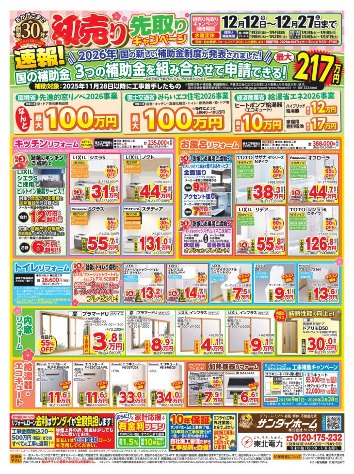 - 東北電力とサンダイホームはリフォーム・リノベーション事業で業務提携しており、両社が共同でキャンペーンを開催いたします。皆様のご来場をお待ちしております。