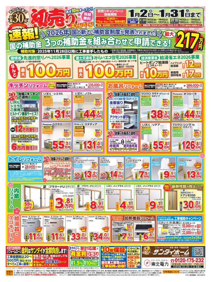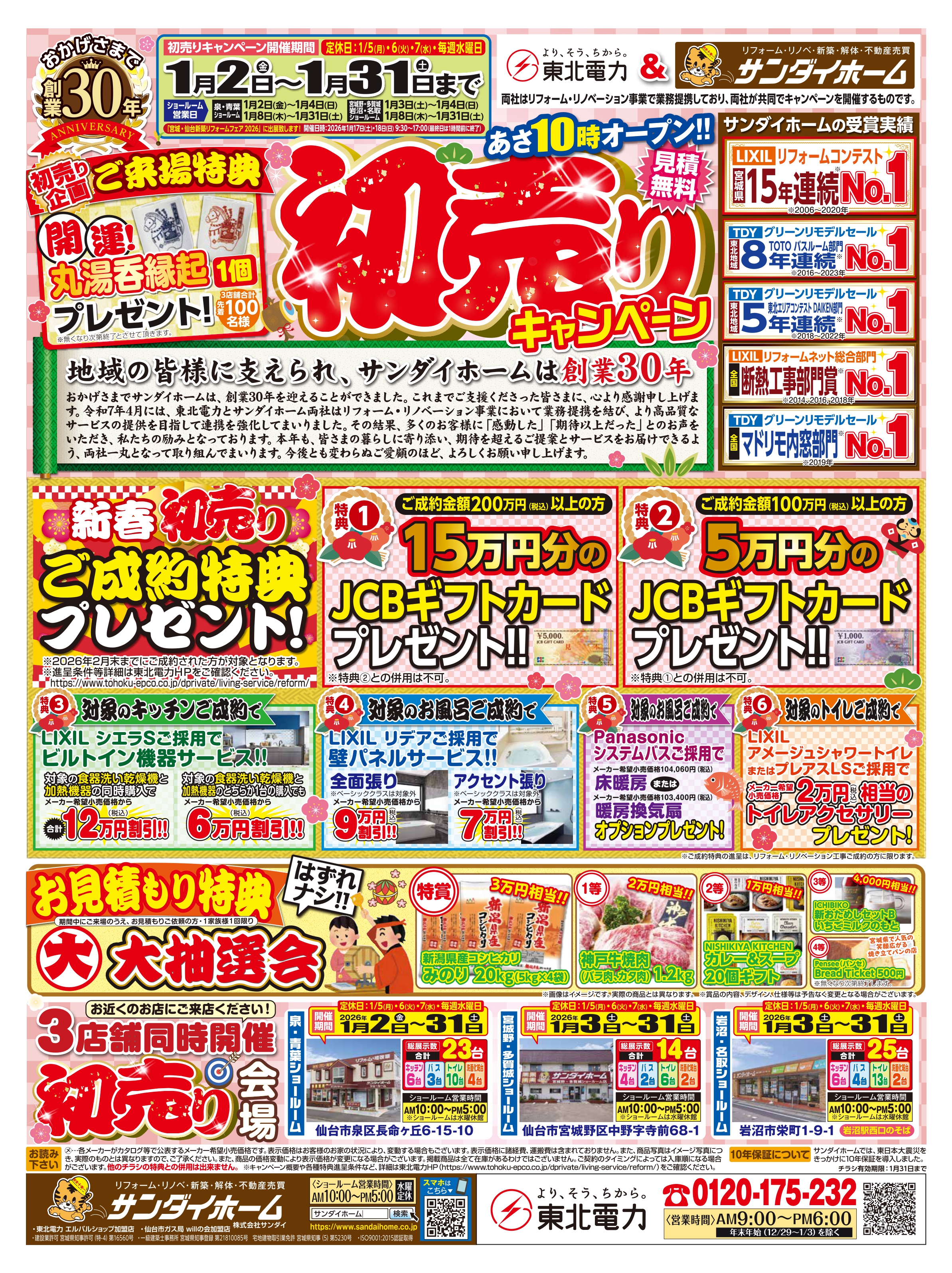 - 東北電力とサンダイホームはリフォーム・リノベーション事業で業務提携しており、両社が共同でキャンペーンを開催いたします。皆様のご来場をお待ちしております。